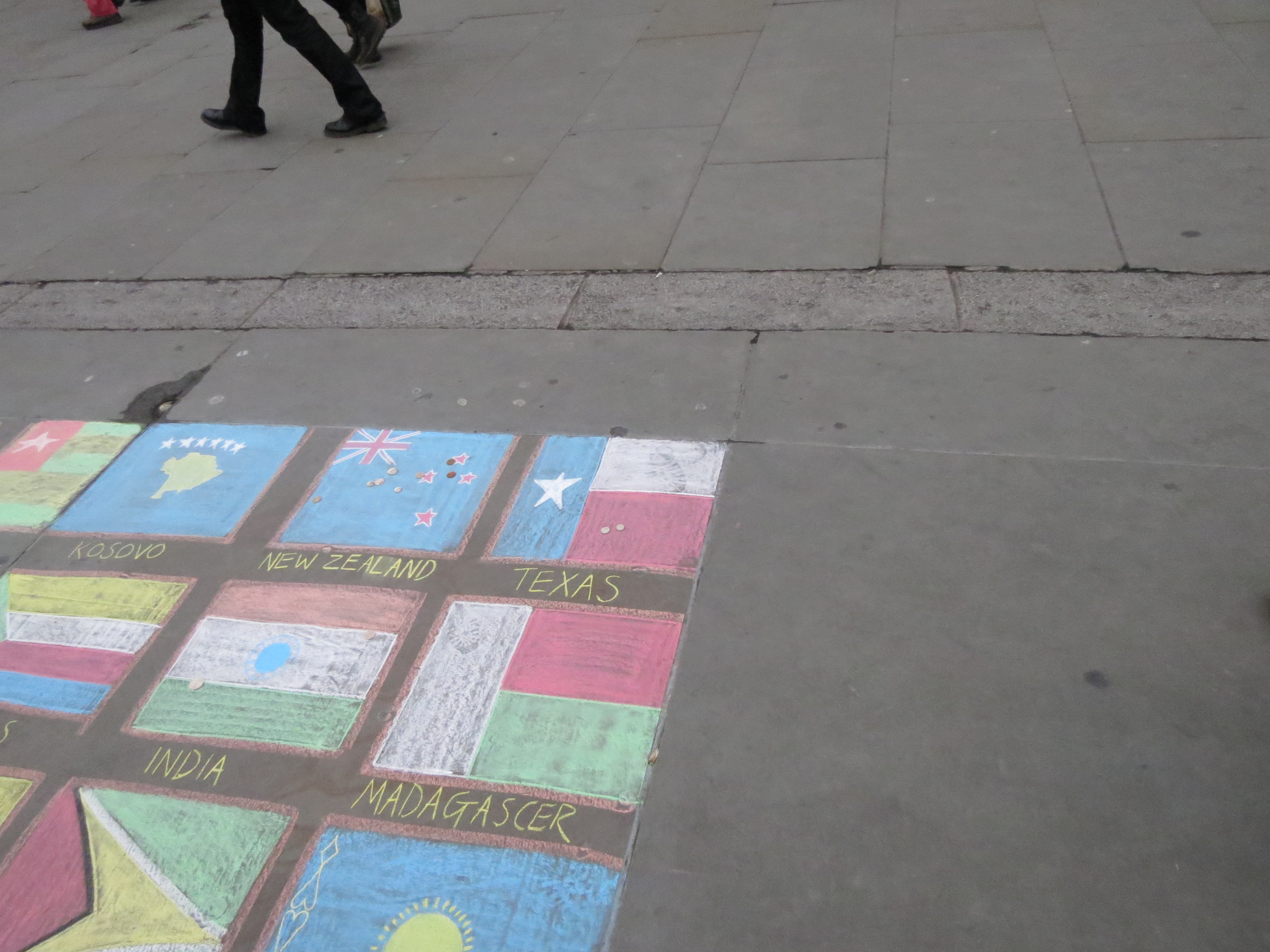 Which makes for fascinating political philosophy, I hear you ask, but what’s the point? Well, having lived there once (and I admit it was largely a negative experience, though I wouldn’t mind trying out Austin since I’ve heard good things), my family and I sometimes joke that Texas at its heart really is a separate country altogether. London recently confirmed my suspicions by way of a chalk artist in Trafalgar Square.