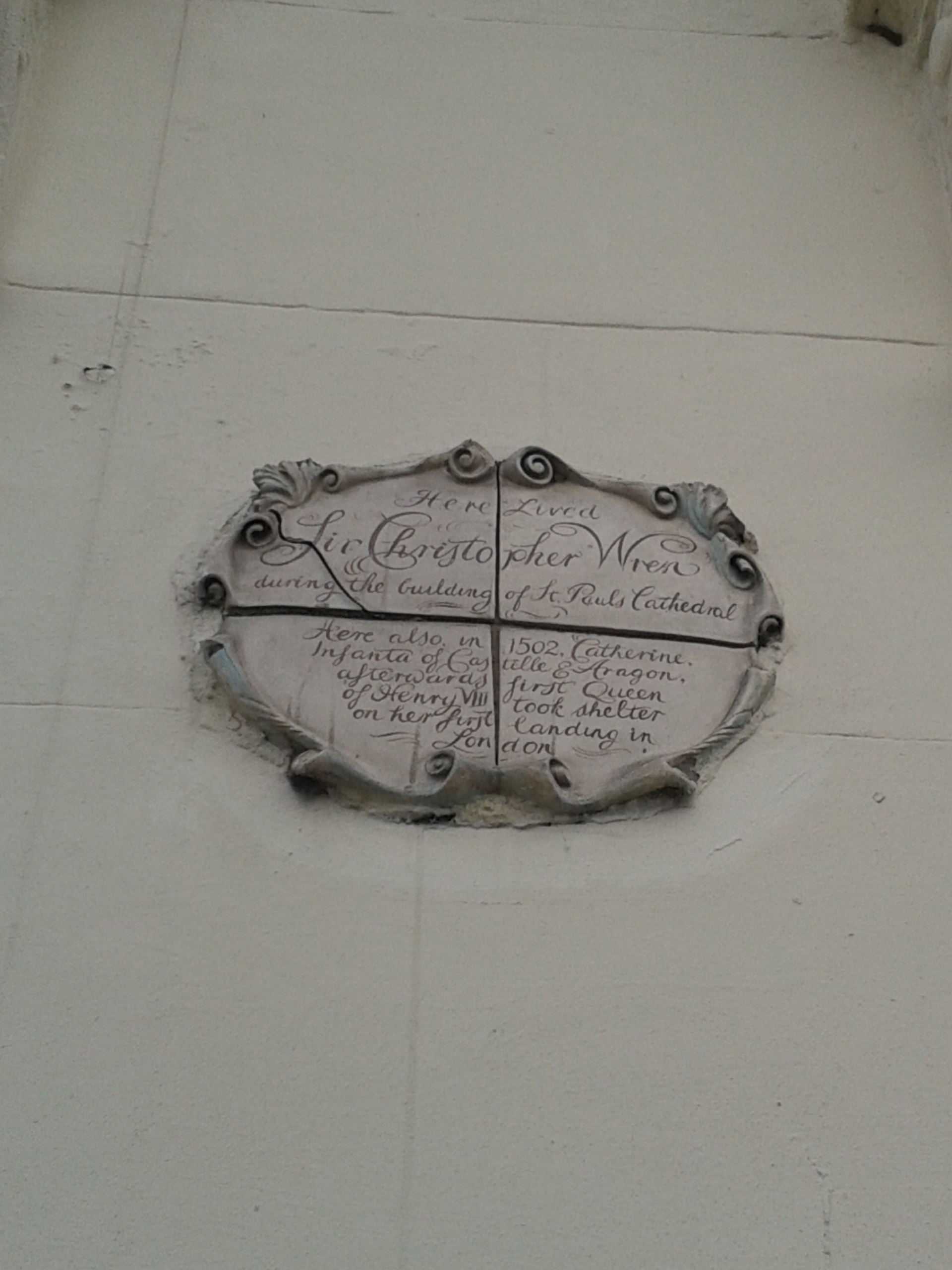 Which, if squinting isn’t a help, reads, “Here lived Sir Christopher Wren during the building of St Paul’s cathedral. Here also, in 1502, Catherine Infanta of Castile and Aragon, afterwards first queen of Henry VIII, took shelter on her first landing in London.”