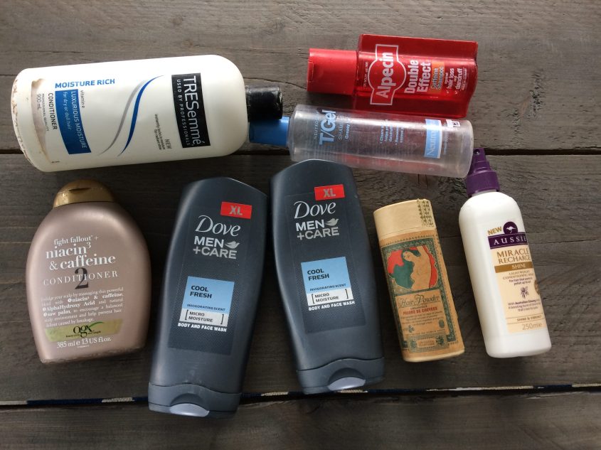 Hair continues to be my personal Waterloo, but here are some of the mane-taming products I used up recently, along with a couple of shower bits. I’m not precious about my bathing and use Jeff’s razors and bodywash without shame. In fact, I’m positive I missed at least two bottles of bodywash that rightly should have been included in this confessional but recycled them first. Oops. My eczema continues to wreak havoc on my scalp, hence the two different medicated shampoos (also probably not an honest reckoning), but I did manage to make it through two bottles of conditioner. A powder style dry shampoo and leave-in conditioner round off the pack. The powder smells wonderful but I would not repurchase as I’ve found a much better spray formula. All the other items, however, are pretty much my standard shower rotation and their replacements are in situ.
