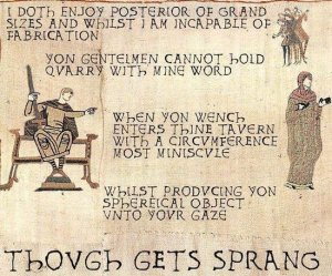 The Anglo Saxons (go here and carefully note the caption!), watching this from their Germanic homesteads with glee, could see an upwardly mobile real estate deal when it presented itself, so bunches of the upped sticks and sailed over.  They originally were hired as mercenary protectors by the Britons, but they didn’t go in much for togas compared to rape and pillage and within a few years had taken over and set about to dividing into small kingdoms and declaring war on each other to their hearts’ content.  They also brought their language, on which somewhat better records were kept.  A few centuries later, just as soon as they’d got themselves unified into some semblance of order and had started keeping excellent chronicles, a Norman across the Channel decided he ought to be king.  William the Bastard, for that was his unfortunate name,  invaded and won.  He ousted the Anglo Saxon lords and installed his own Old-French-mixed-with-Latin-again speaking cronies instead, further enriching the language and changing his name to the much more impressive sounding William the Conqueror.
