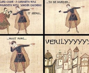 In continuing C.-is-a-history-dork news, I’ve discovered an entire internet meme genre I didn’t know existed, based on the Bayeux Tapestry.  How could I not have known of this?!