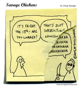 But Friday the 13th has always puzzled me. I know a great many people like me, who seem to have nary a superstitious bone in their body, who get well and truly freaked out when a 13th rolls around. I’ve seen people stay home from work to avoid accident! When I was still a student, my flatmates and I would hold a Hitchcock movie party every Friday the 13th, it seemed a much more entertaining way to spend an evening than paranoia. I think I’ll resurrect the tradition tonight, come to think of it! All minions are invited to participate vicariously.