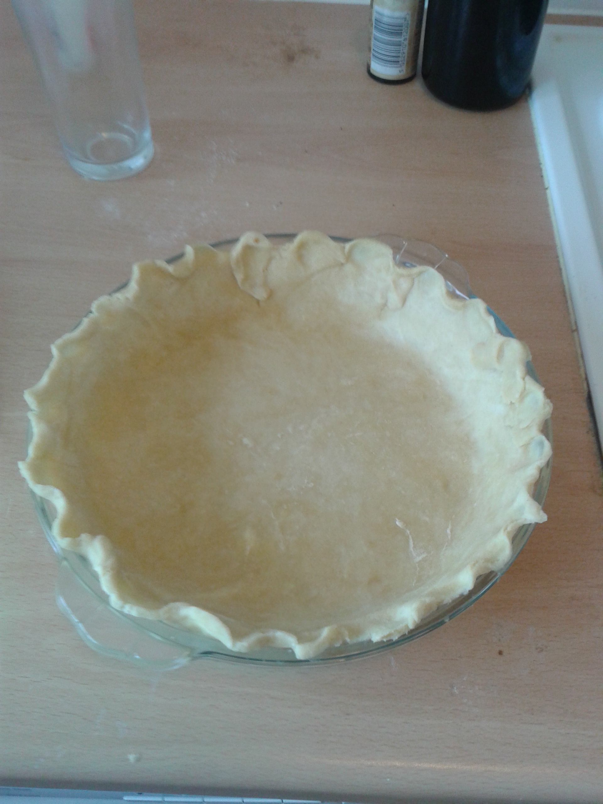 First I had to find a pie crust recipe that didn’t call for shortening (a heathen American device). I was fine with this because, butter. Then I whipped it up by hand because we have no kitchen equipment besides a mixing bowl that’s a third of the size of what we’re used to, before leaving it to chill in the fridge overnight. The next morning I rolled it out with a highball glass in lieu of a roller (see: lack of kitchen equipment).