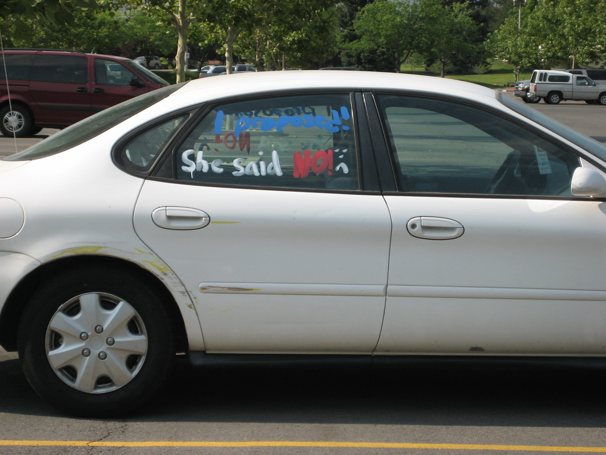 We live in a notorious marriage mart of a town, but clearly things didn’t work out typically for this gentleman… And apparently he has very cruel friends or relationships. Snagged this sad gem in a local parking lot.