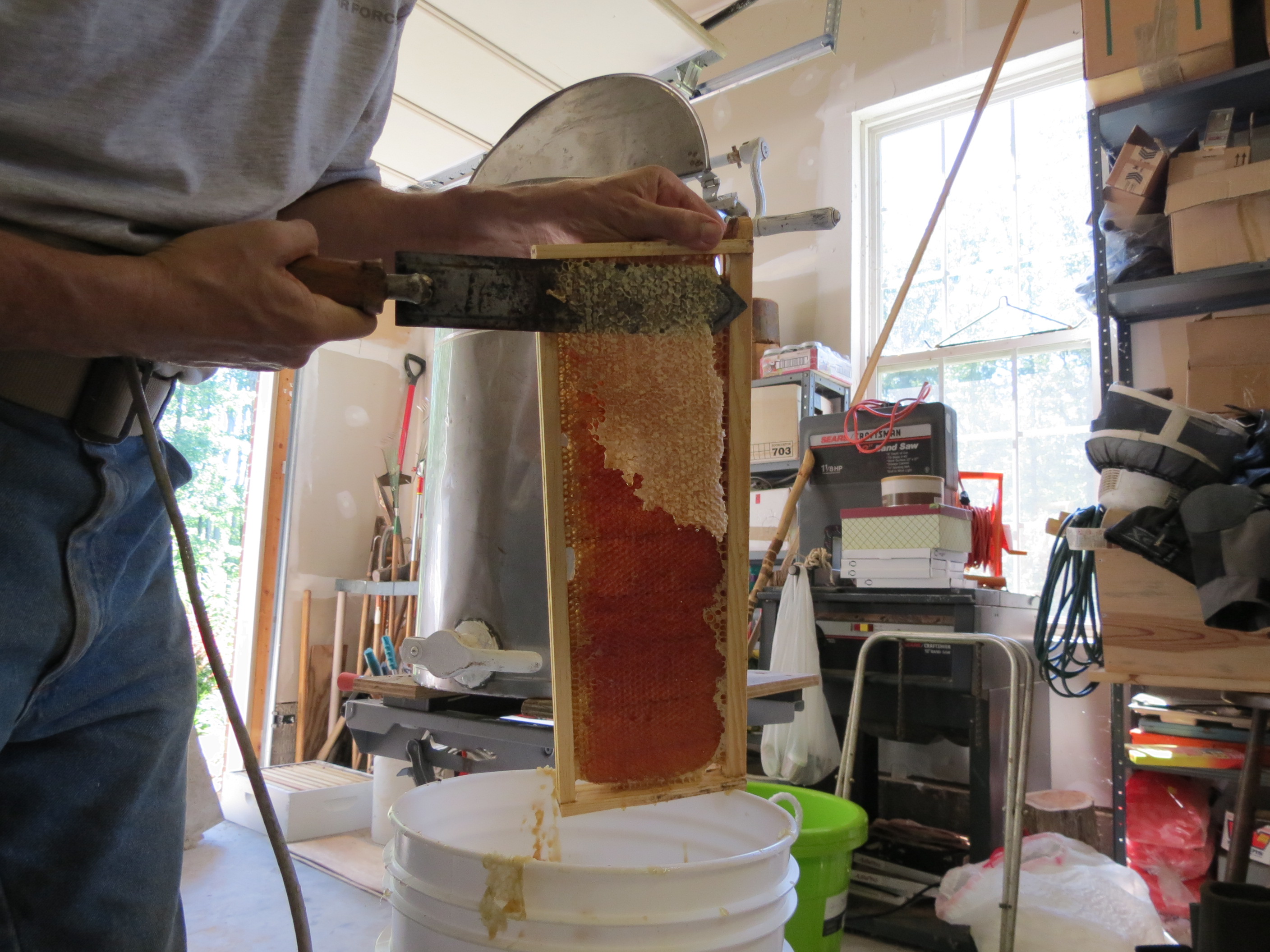 Once he smokes the bees and takes the hive boxes he wants to harvest, the next step is to extract the honey.
